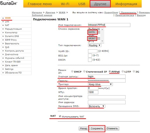 Под обычным доступом с правами админа — admin/admin — вам доступно только DHCP+L2TP. А вот чтобы настроить PPPoE, Динамический или Статический IP, Вам нужно зайти под суперюзером — логин SuperUser, пароль Beeline$martB0x.